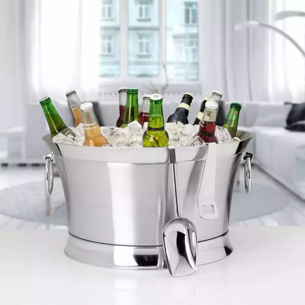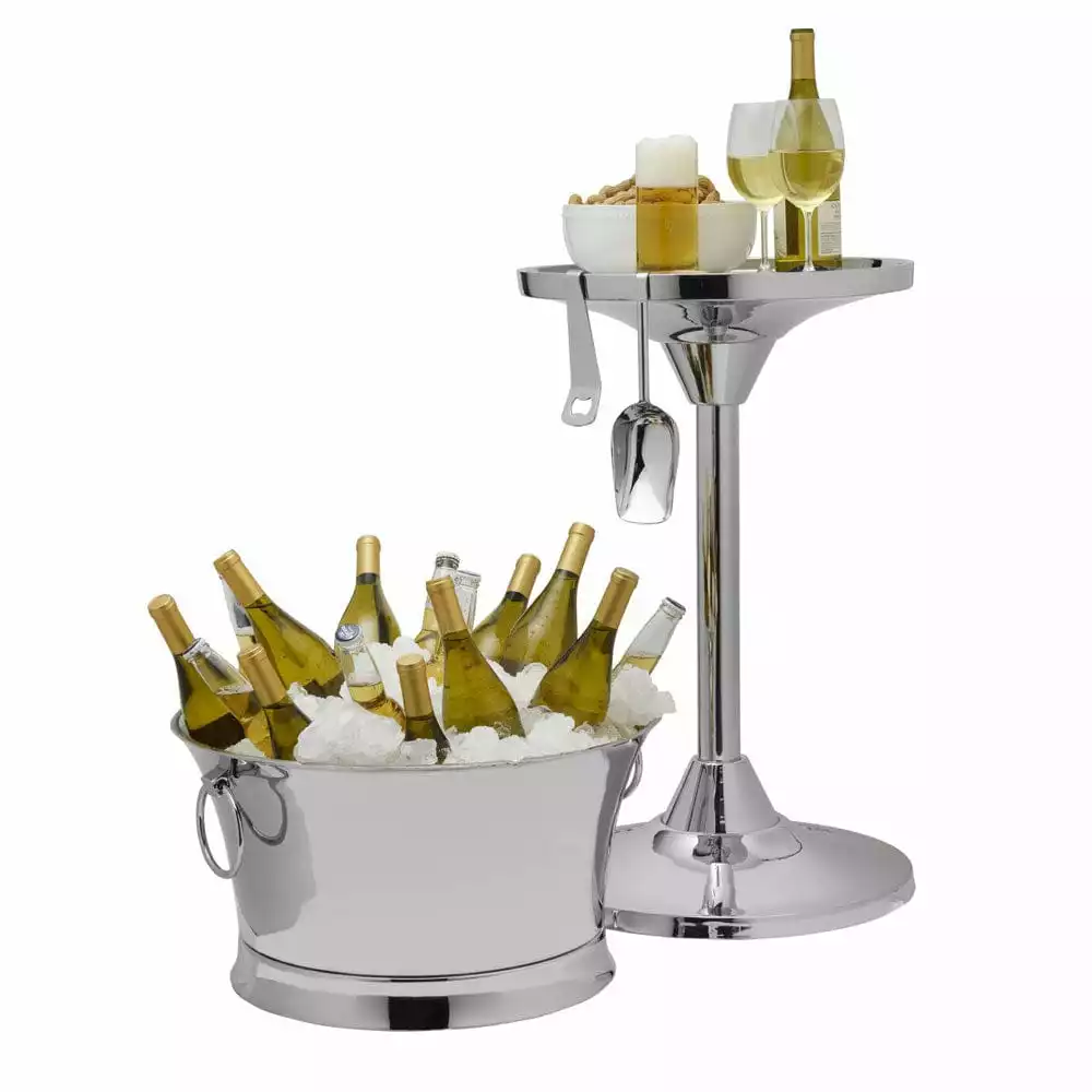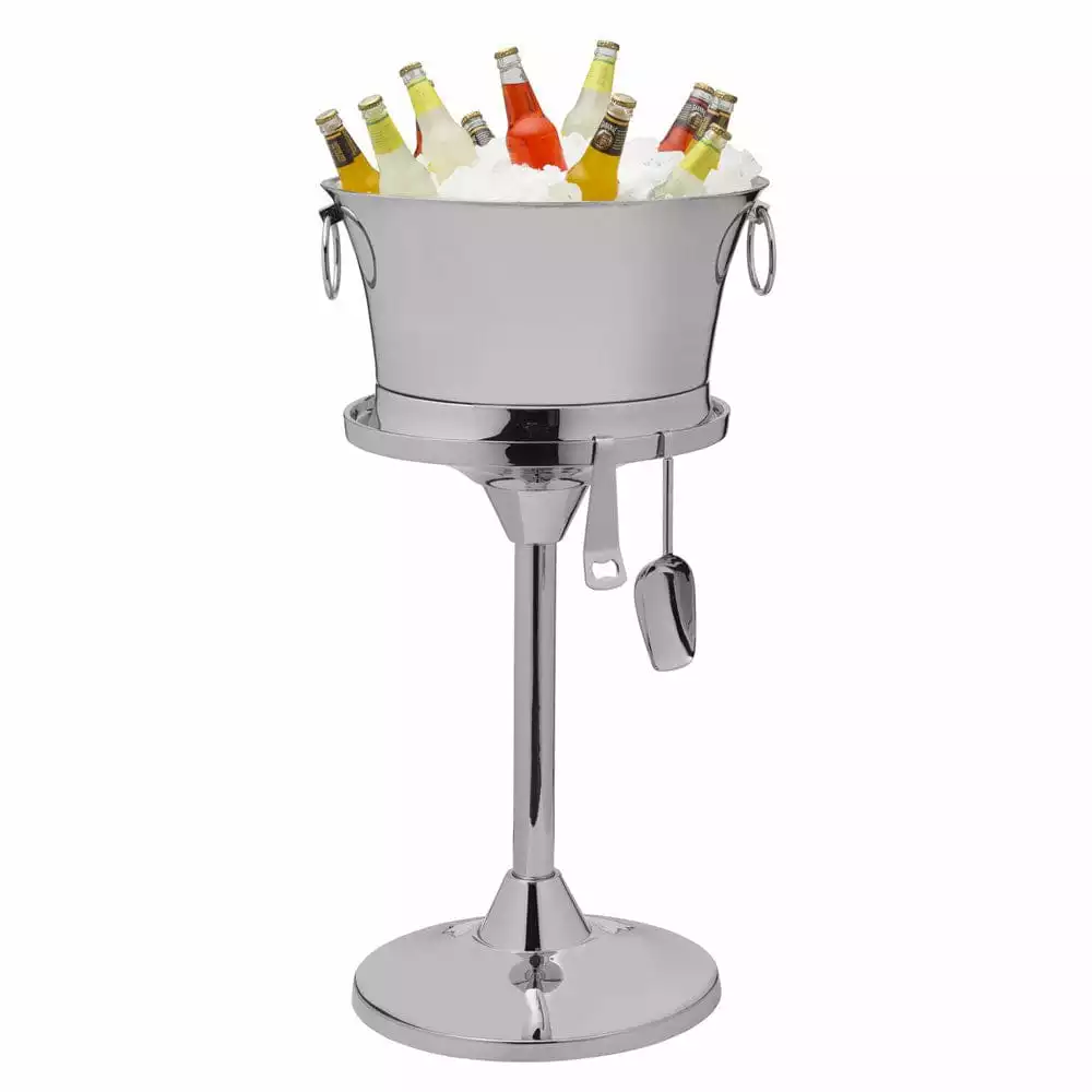 This 30 Quart Double Wall Beverage Tub with Stand and Tools can be beautifully displayed on or off the stand. The double-walled 18/8 stainless steel tub guarantees maximum cold retention without condensation. Crafted of stainless steel. Hand wash. Set includes 30 quart tub, stand, ice scoop and bottle opener. Tub measures 20-1/2 inch diameter x 11 inch high; 40-1/2 inch high with stand and can hold up to 10 standard wine bottles.