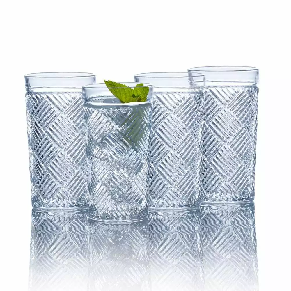 Mikasa Ballard Braid barware sets are uniquely designed with fashion and function in mind; with an elegant traditional pattern that creates texture and shine. This attractive set will coordinate with all casual patterns both modern and traditional. Dishwasher safe. Set of 4 highball glasses, each measures 5-1/2 inch high and holds 11-3/4 ounces.