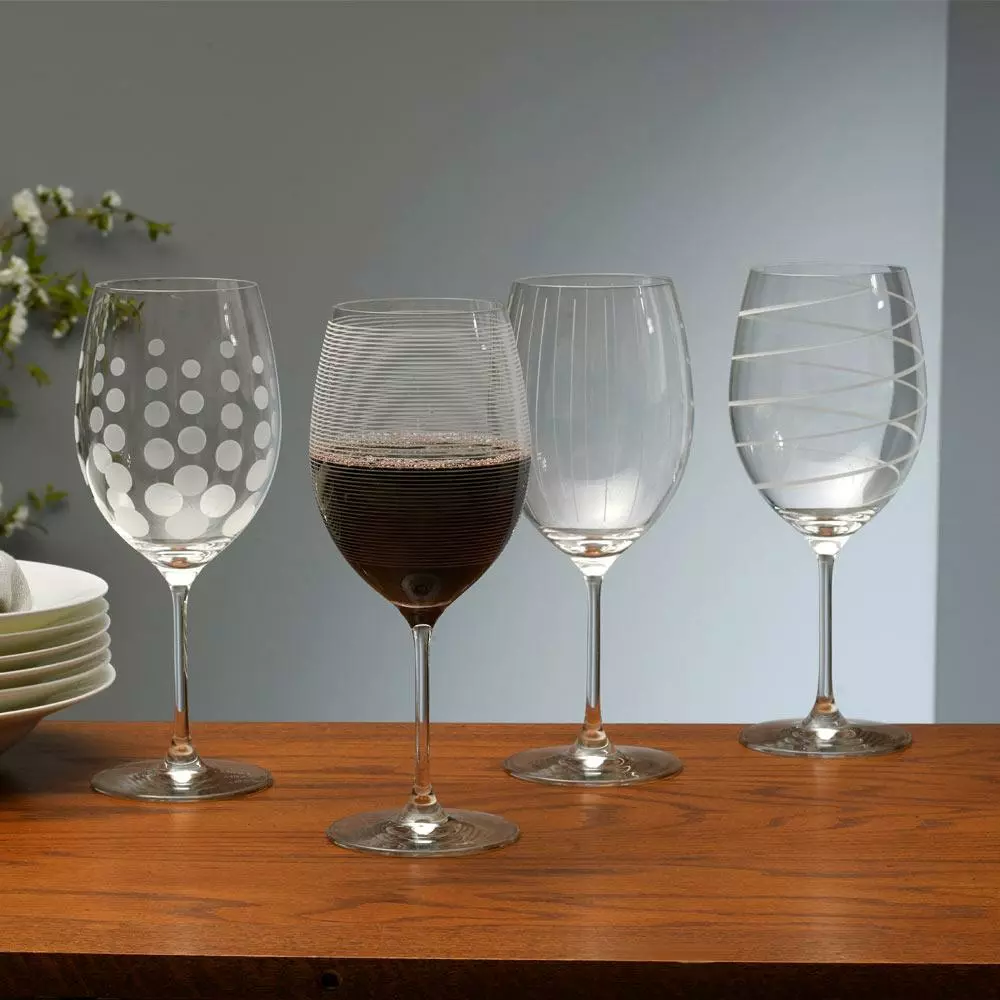 The fun and whimsical designs of the Cheers collection set a festive mood at any gathering. Each glass in the set of 4 is precision-etched with a different yet coordinating design. The dots, lines, and swirls are also distinctive, so each of your guests can easily identify their glass without the need for wine charms. Dishwasher safe – top rack. Set of 4 red wine glasses, each measures 9-1/4 inch high x 3 inch diameter rim and holds 24 ounces.