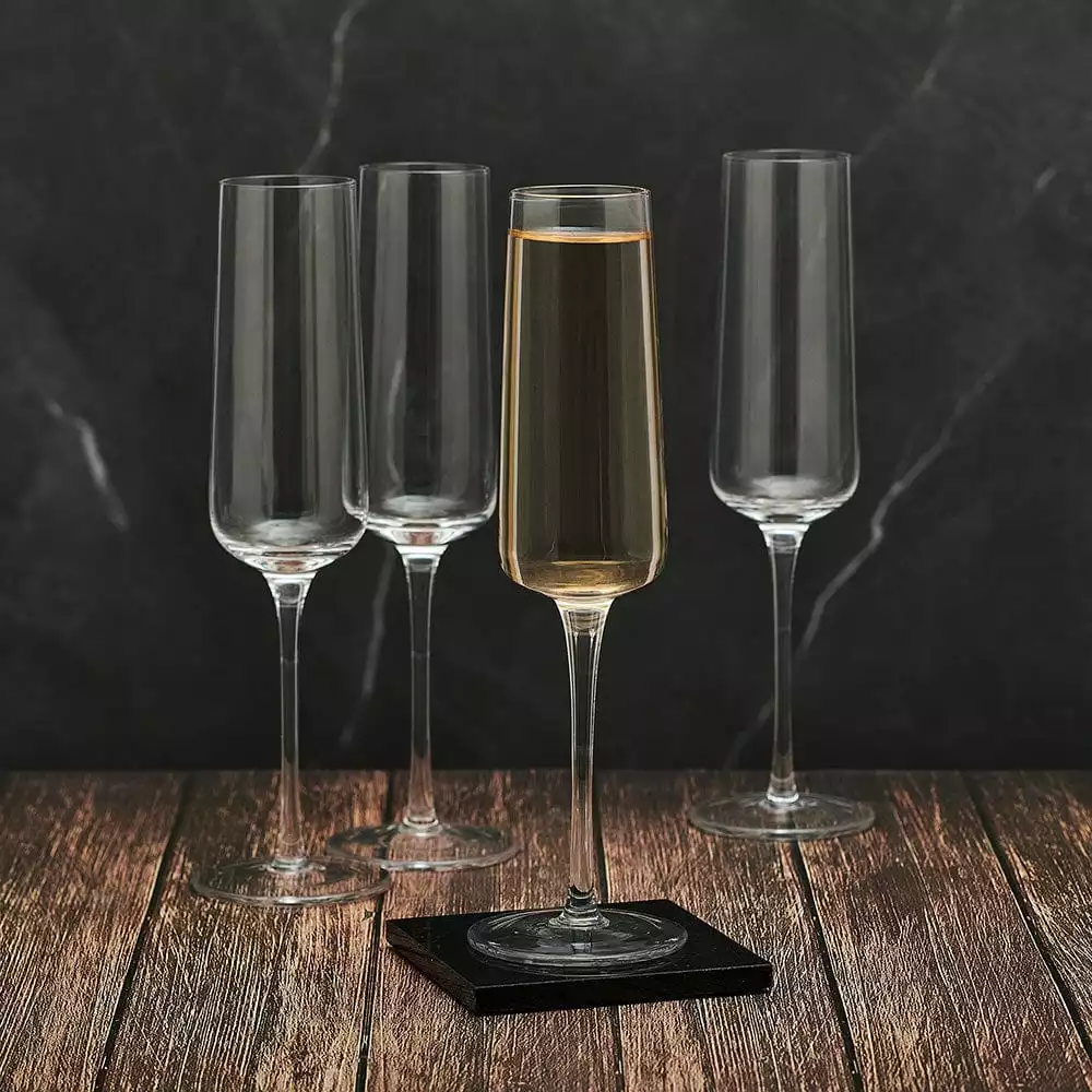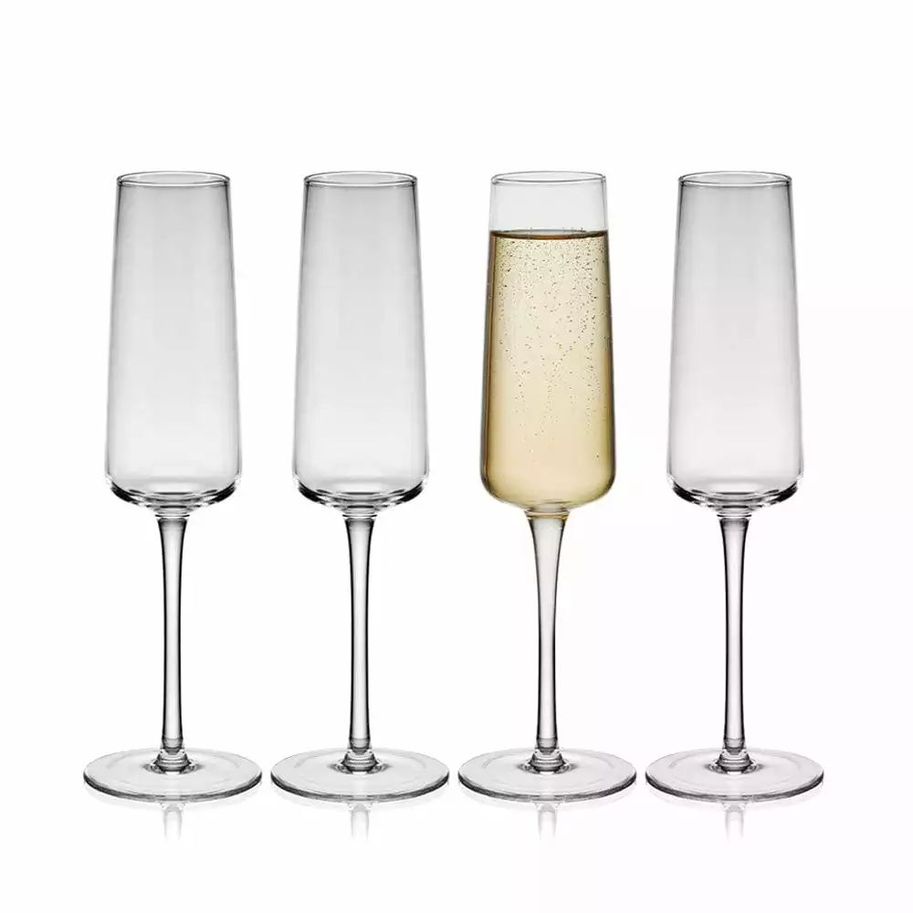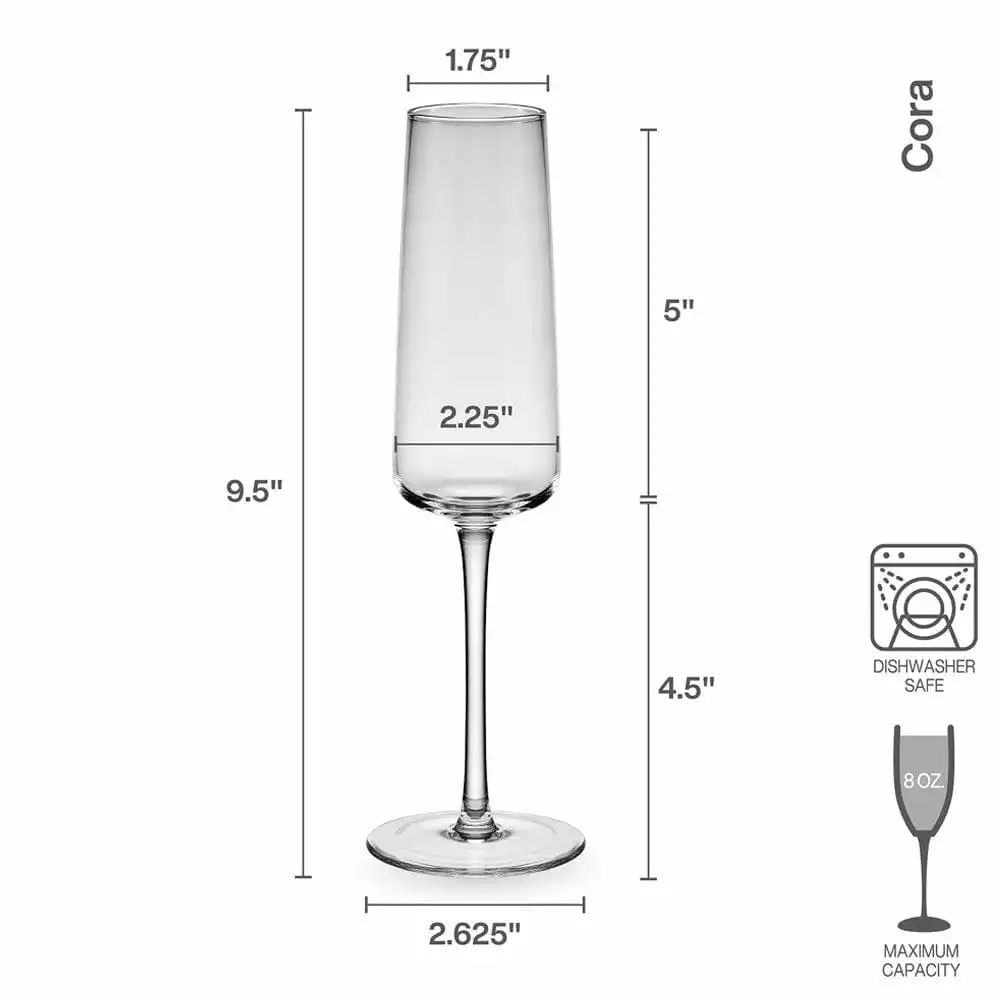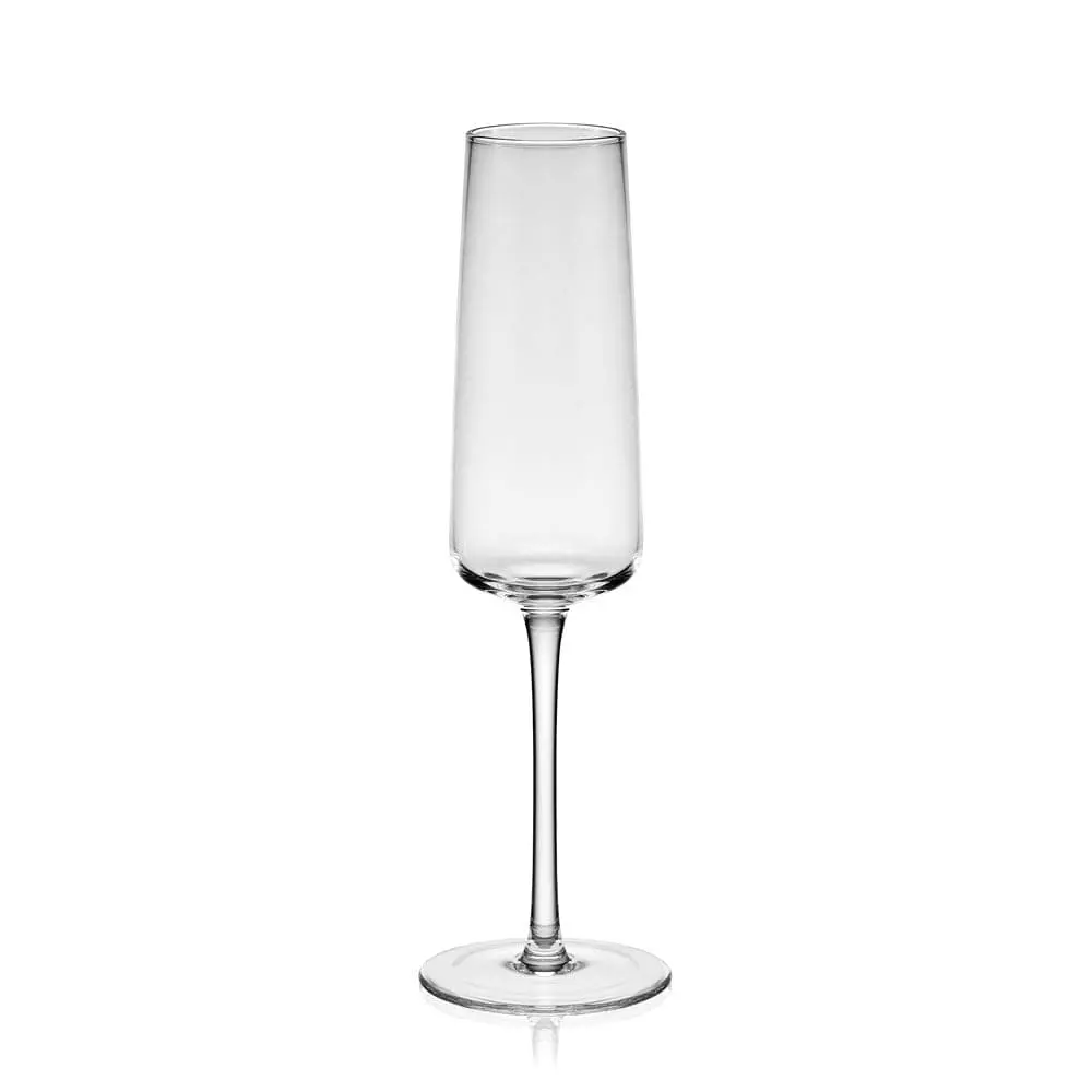 This Cora Flute Glass Set features unexpected curves that flare outward to wide bases, with tapered tops designed to capture the bouquet of wine and spirits to heighten your experience.