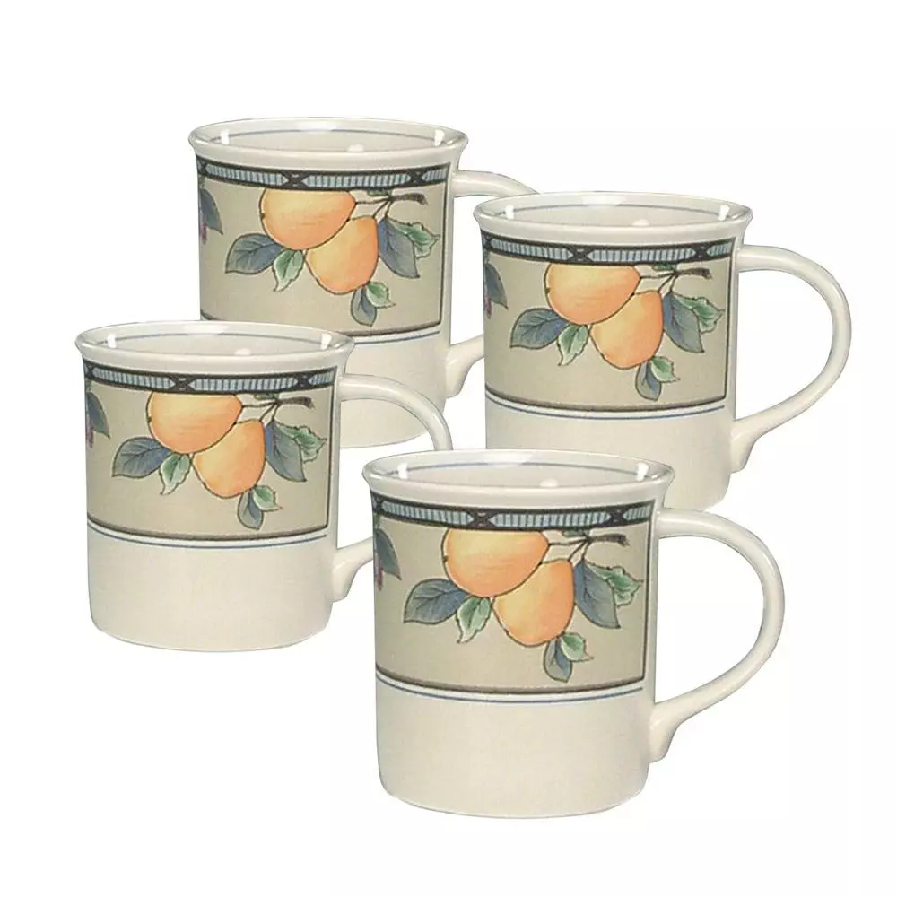 Colorful fruits and leaves enliven the Garden Harvest pattern. This longtime favorite is perfect for everyday use and has a wide array of accessories to create a complete casual dining statement. This pattern coordinates perfectly with casual stemware and flatware and is dishwasher safe, oven safe, freezer safe and microwave safe. Crafted of stoneware. Set of 4 mugs, each holds 11 ounce.
