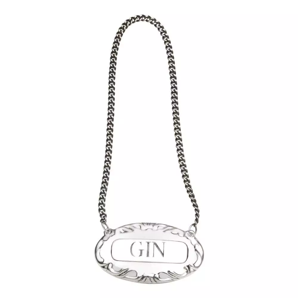Add elegance to your home bar with this Empire Silver Gin Liquor Label. This liquor label includes a silver chain to hang around the neck of your decanter with the word “Gin”. Bring the luxury of sterling to your cocktail hour for elegance and sophistication. Crafted of sterling silver. Made in America. Bourbon liquor label measures 1-3/4 inch wide x 1 inch high.