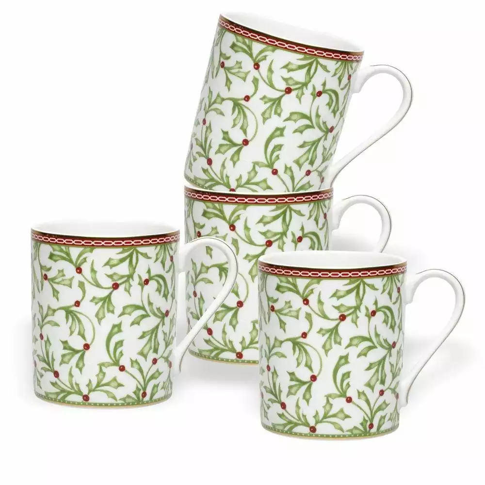 Bring some festive and elegant touches to your holiday celebration with Holiday Traditions. Elegant dinnerware features a charming holly and berry motif with gold banding for a timeless statement. Crafted of porcelain. Dishwasher safe, but not microwave safe. These mugs are great for any festive hot drink. Set of 4 mugs, each holds 12 ounce.