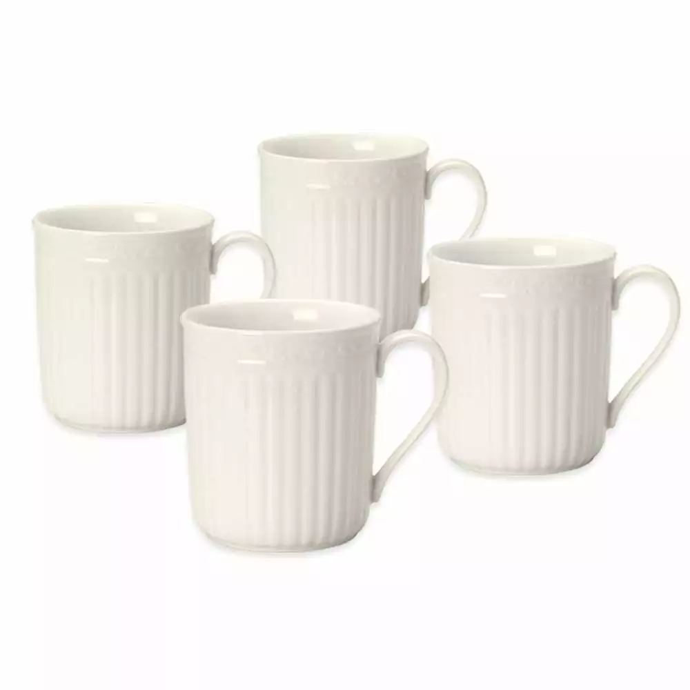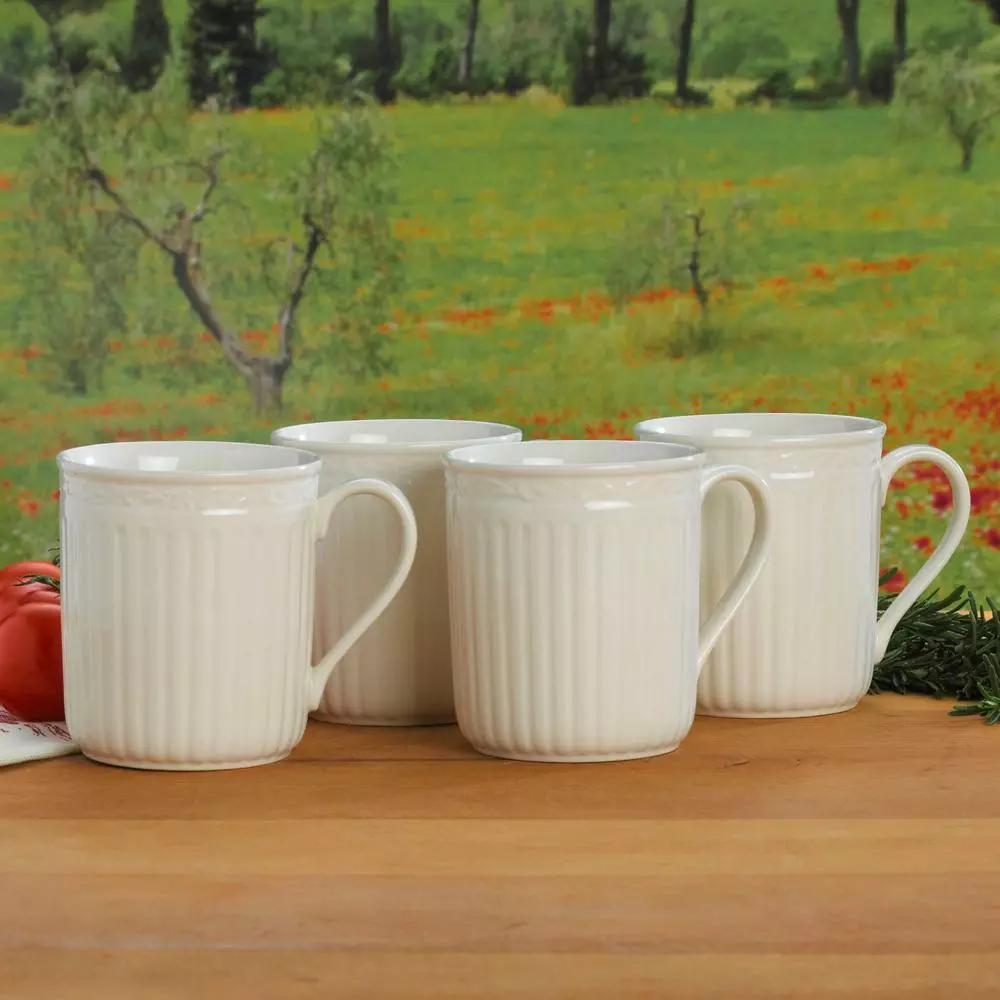 The fluted bands of this dinnerware and column-like detailing recall classical Italian architecture. Complete suite of accessories to create a classically stylish casual dining statement. Distinctly beautiful design of scrolls and fluting. Perfect for casual entertaining. Stoneware. Dishwasher and microwave safe. Set of 4 mugs, each holds 11 oz.