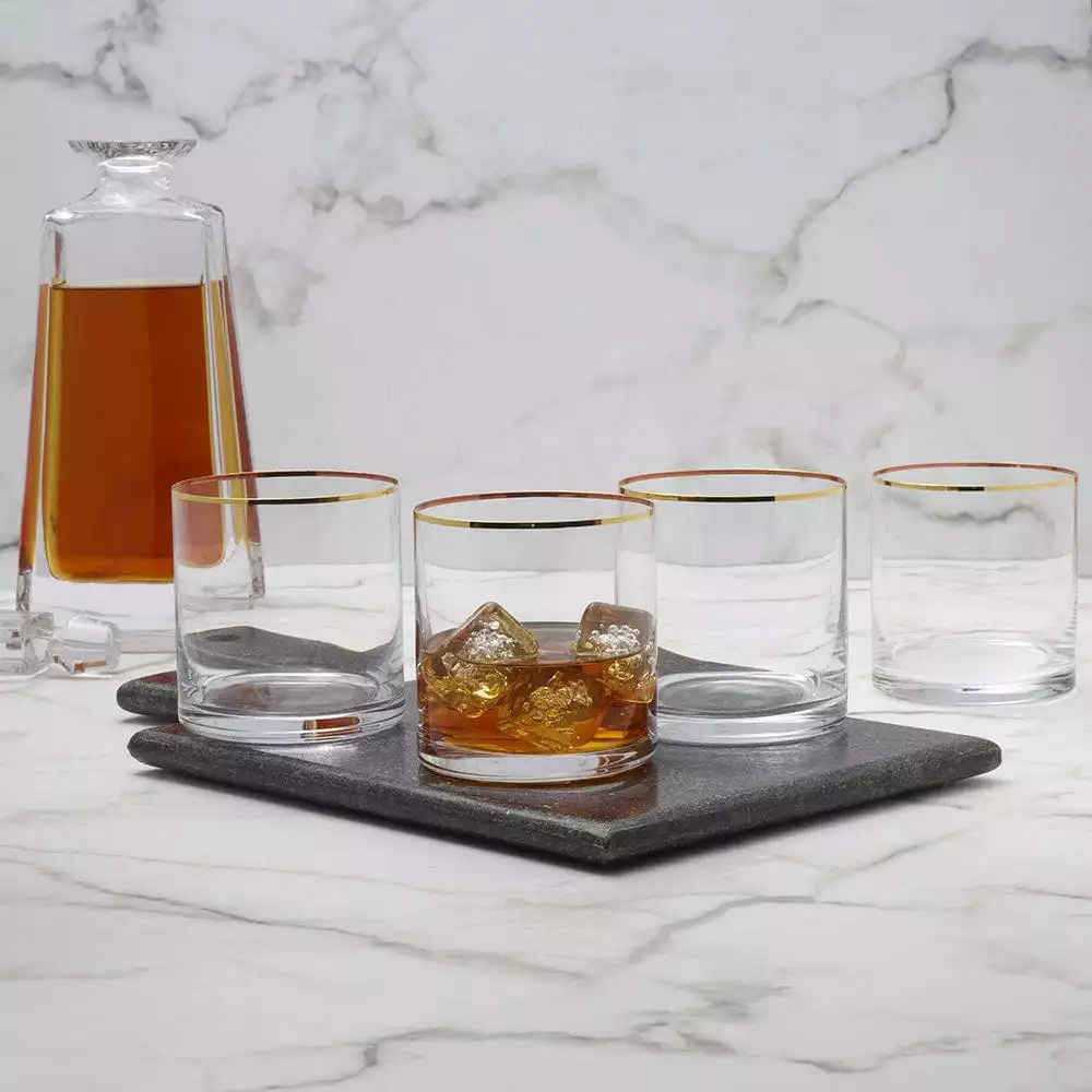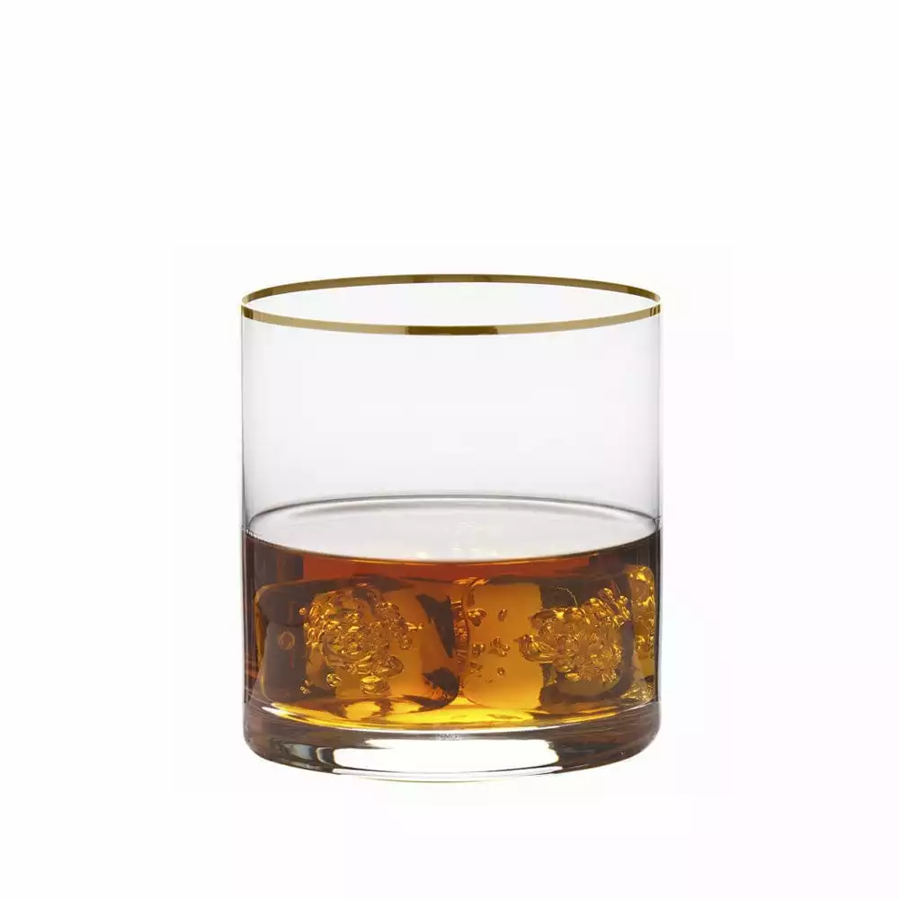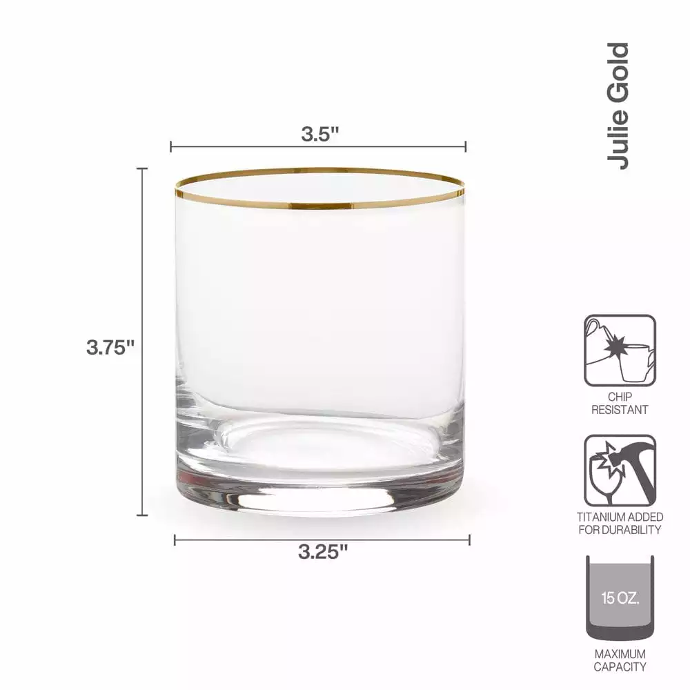 This Mikasa Julie Gold Set of 4 Double Old Fashioned Whiskey Glasses features a clear glass design that will shine beautifully in the light, with a hand-painted gold band around the rim, which will bring a touch of sophistication to any occasion.