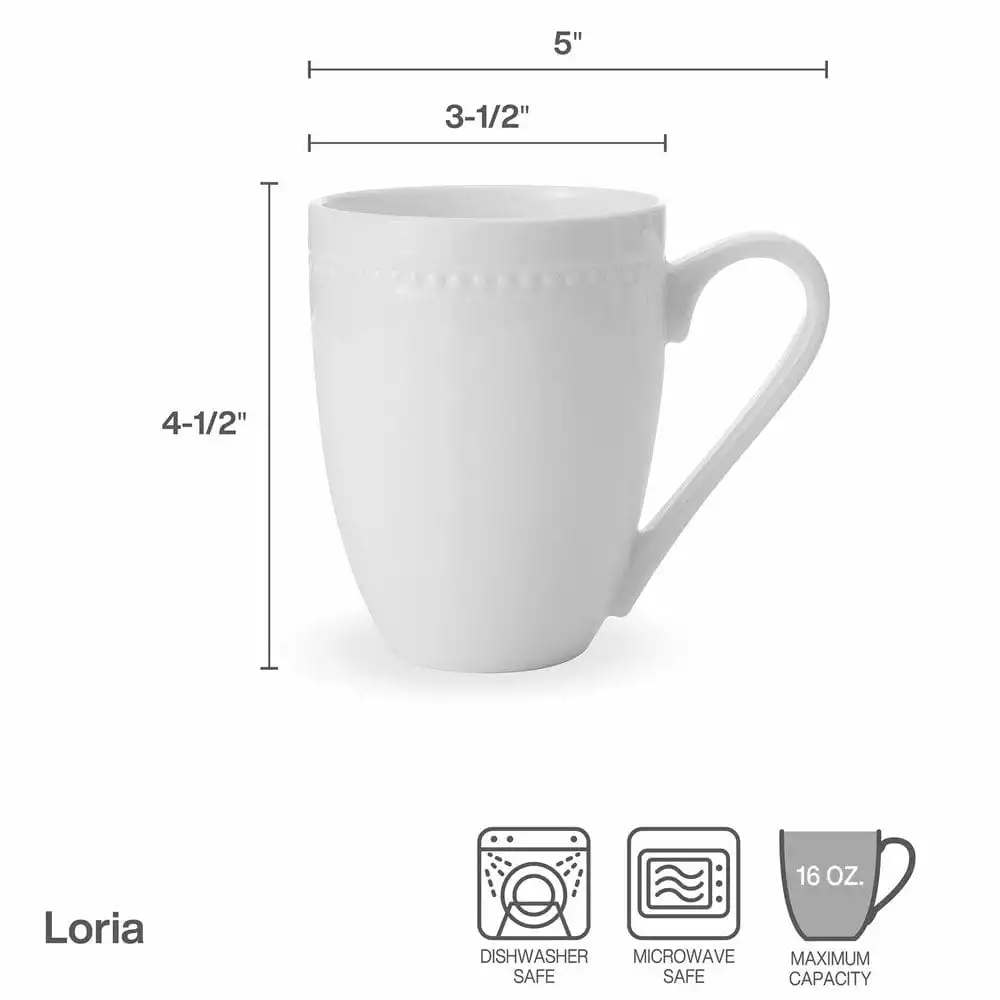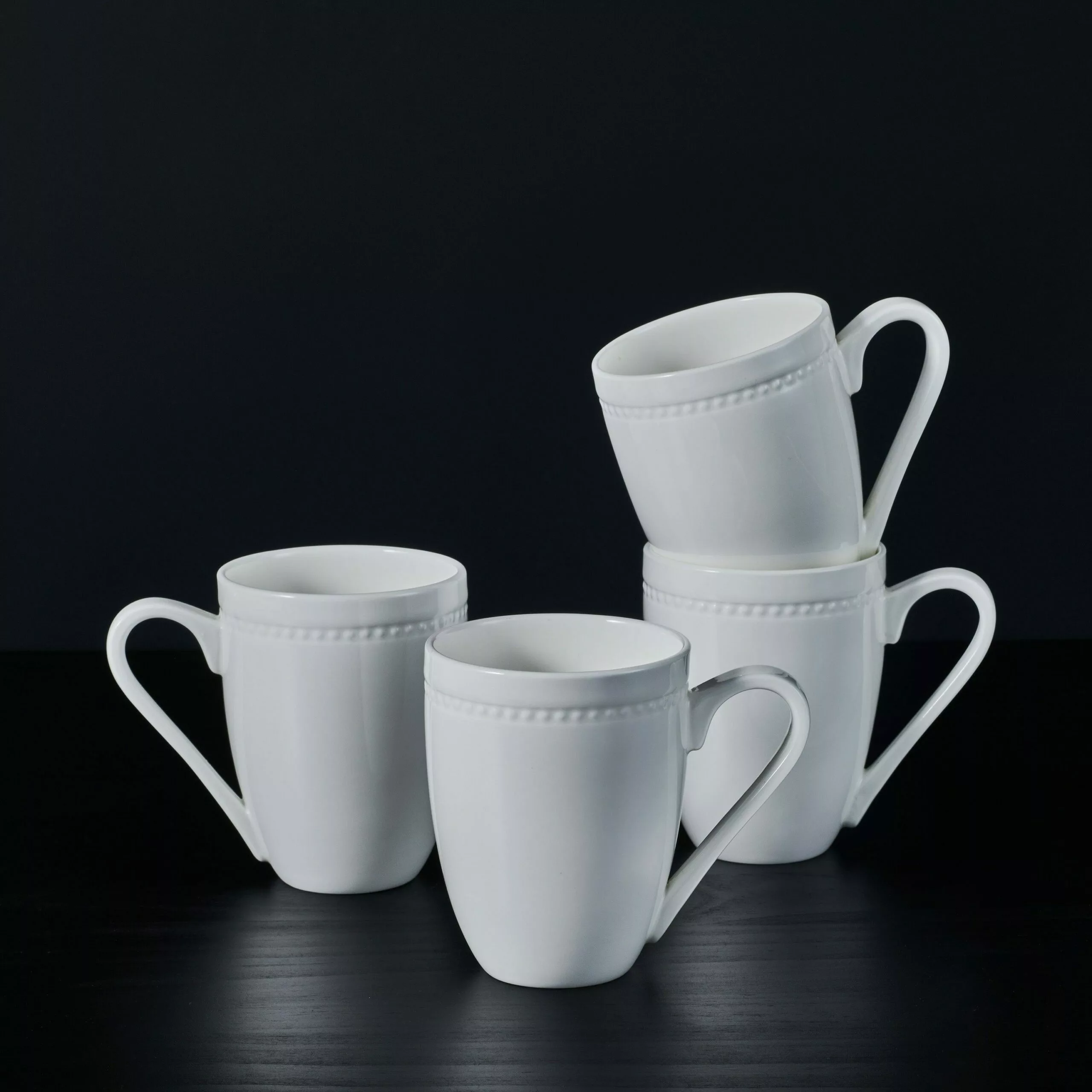 This Loria Set of 4 Mugs feature a pristine white background with a simplistic embossed bead design wrapping around the rim, and will add a touch of style to your table.