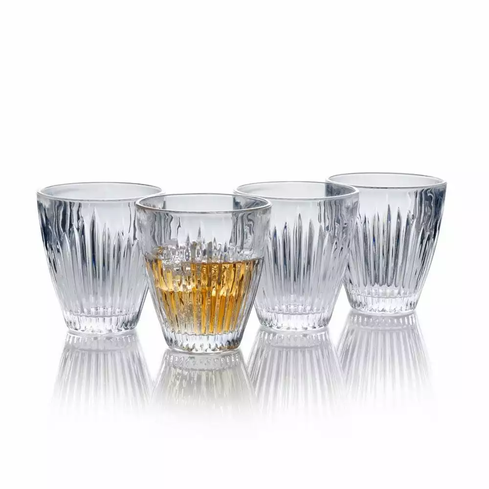 Mikasa Parkside barware is uniquely designed with fashion and function in mind. This elegant, traditional pattern features grooved lines that emanate from the thick base, climbing up the side of each glass to create texture and shine that enhances the look of the contents. Beautifully coordinates with all casual patterns, both modern and traditional. Dishwasher safe. Set of 4 double old fashioned glasses, each holds 9-1/4 ounces.