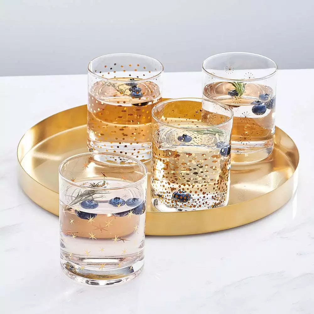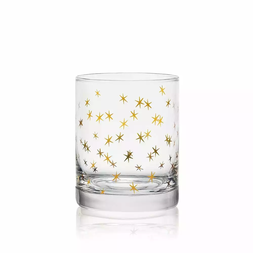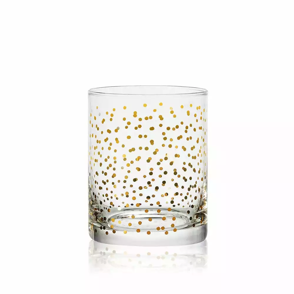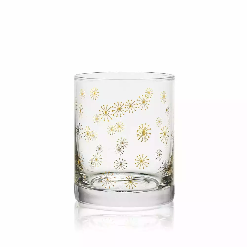 This Party Double Old Fashioned Whiskey Glass Set is sleek and streamlined with contemporary curves, and adorned with patterns of glittery gold and silver, featuring four distinct celebratory patterns, like sparkly confetti, shimmery bubbles, twinkling stars, and firework bursts.