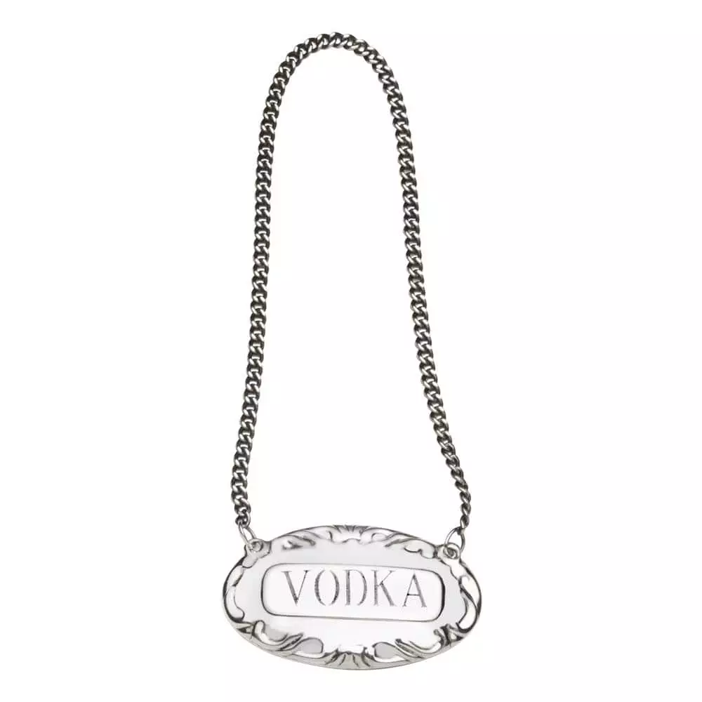 Add elegance to your home bar with this Empire Silver Vodka Liquor Label. This liquor label includes a silver chain to hang around the neck of your decanter with the word “Vodka “. Bring the luxury of sterling to your cocktail hour for elegance and sophistication. Crafted of sterling silver. Made in America. Bourbon liquor label measures 1-3/4 inch wide x 1 inch high.